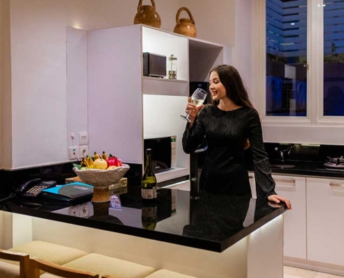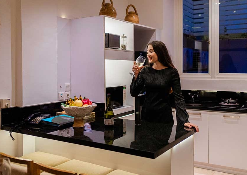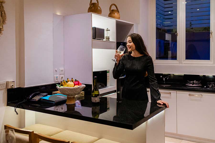 The generous living space features a plush seating area and a kitchenette fitted out with a fridge, microwave, crockery and cutlery. To ensure that our guests are kept in the lap of up-to-the-minute luxury, a flat screen TV with 65 Cable channels and high quality Wi-Fi are provided.
